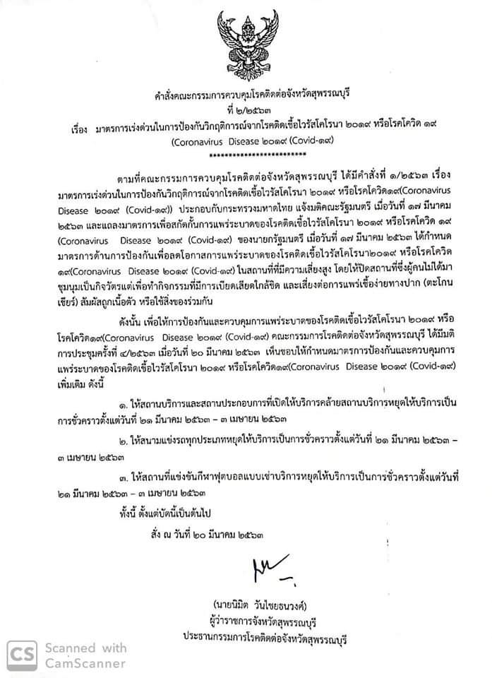 คำสั่งคณะกรรมการโรคติดต่อจังหวัดสุพรรณบุรี ที่ 2/2563 เรื่อง มาตรการเร่งด่วนในการป้องกันวิกฤตการณ์จากโรคติดเชื้อไวรัสโคโรนา 2019 หรือโรคโควิด 19 (Coronavirus Disease 2019 (COVID-19)) #หยุดให้บริการชั่วคราว!!!! สถานบันเทิง/สนามแข่งรถ/สนามกีฬาเช่า ทุกประเภท ตั้งแต่วันที่ 21 มีนาคม - 3 เมษายน 2563